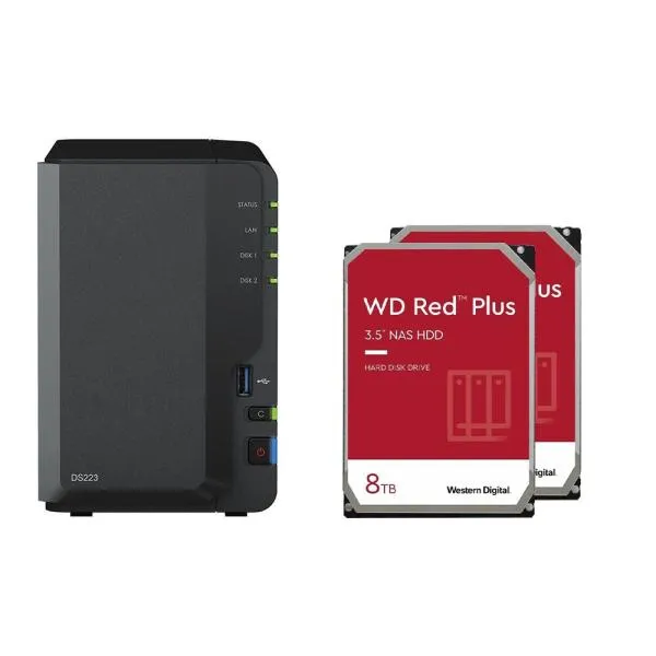 Synology DiskStation DS223 2 rekeszes NAS szerver üres ház + 16TB (2x8TB) WD Red 80EFZZ SATA 3,5″ HDD merevlemezek